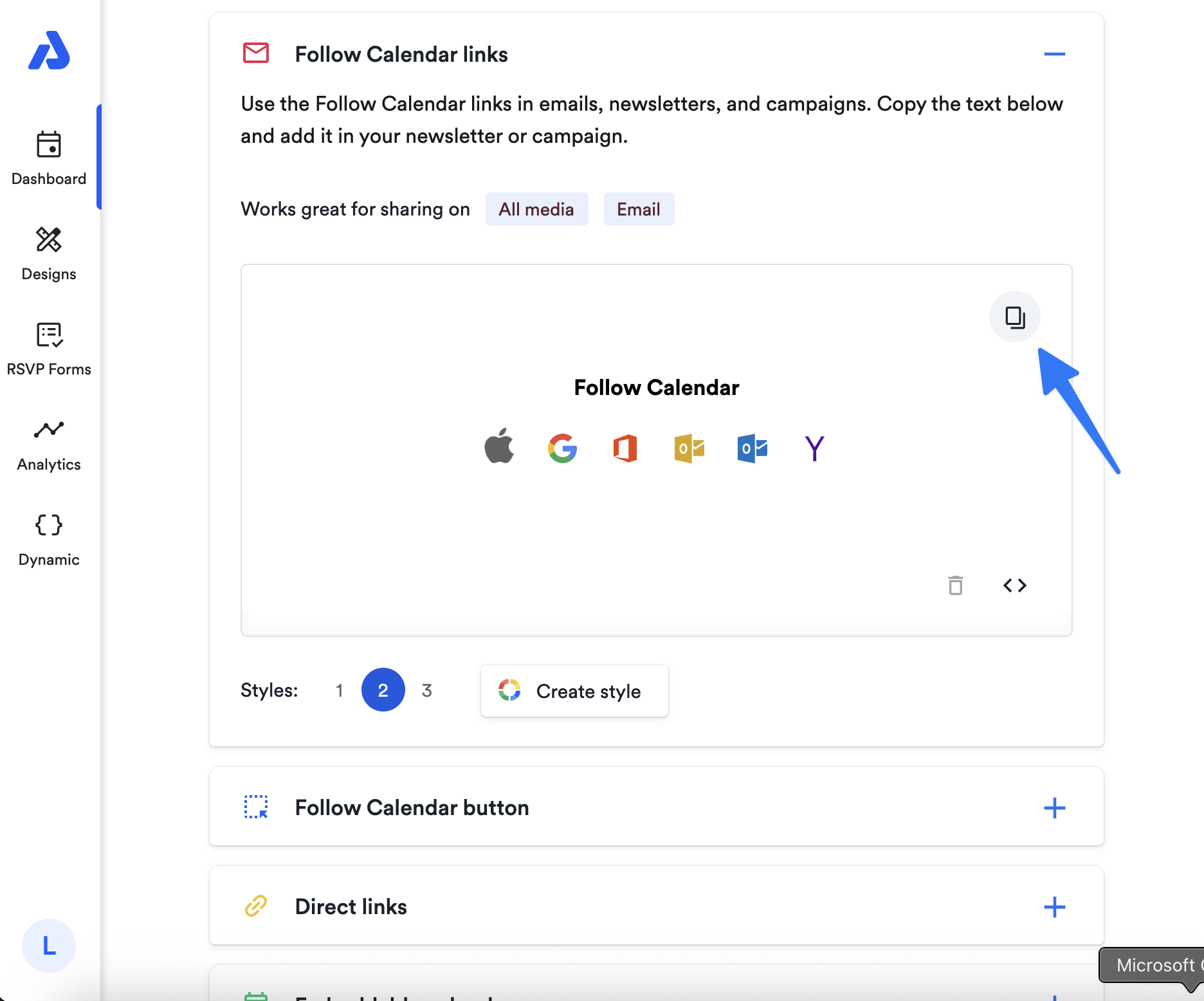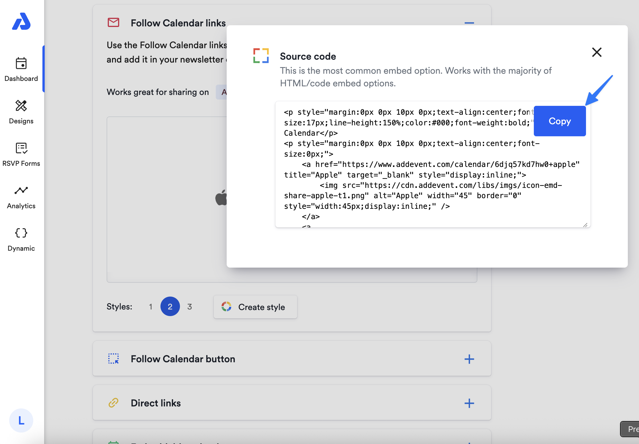 Select the preferred style of Follow Calenaar links and click the Copy button in the top right corner.