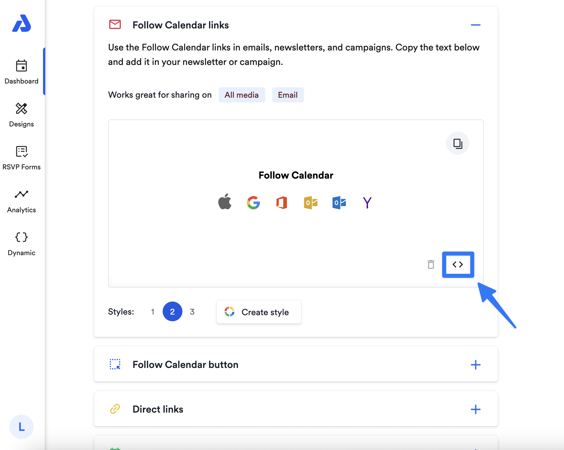 If you’re using an email sender like Mailchimp or HubSpot, you can use the source code to embed Follow Calendar links. Follow these steps to use the source code version: