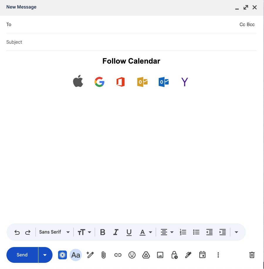 Add the Link to Your Email or Campaign: Paste the copied Follow Calendar links directly into the content editor of your email, newsletter, or campaign (as shown in the Gmail example below).
