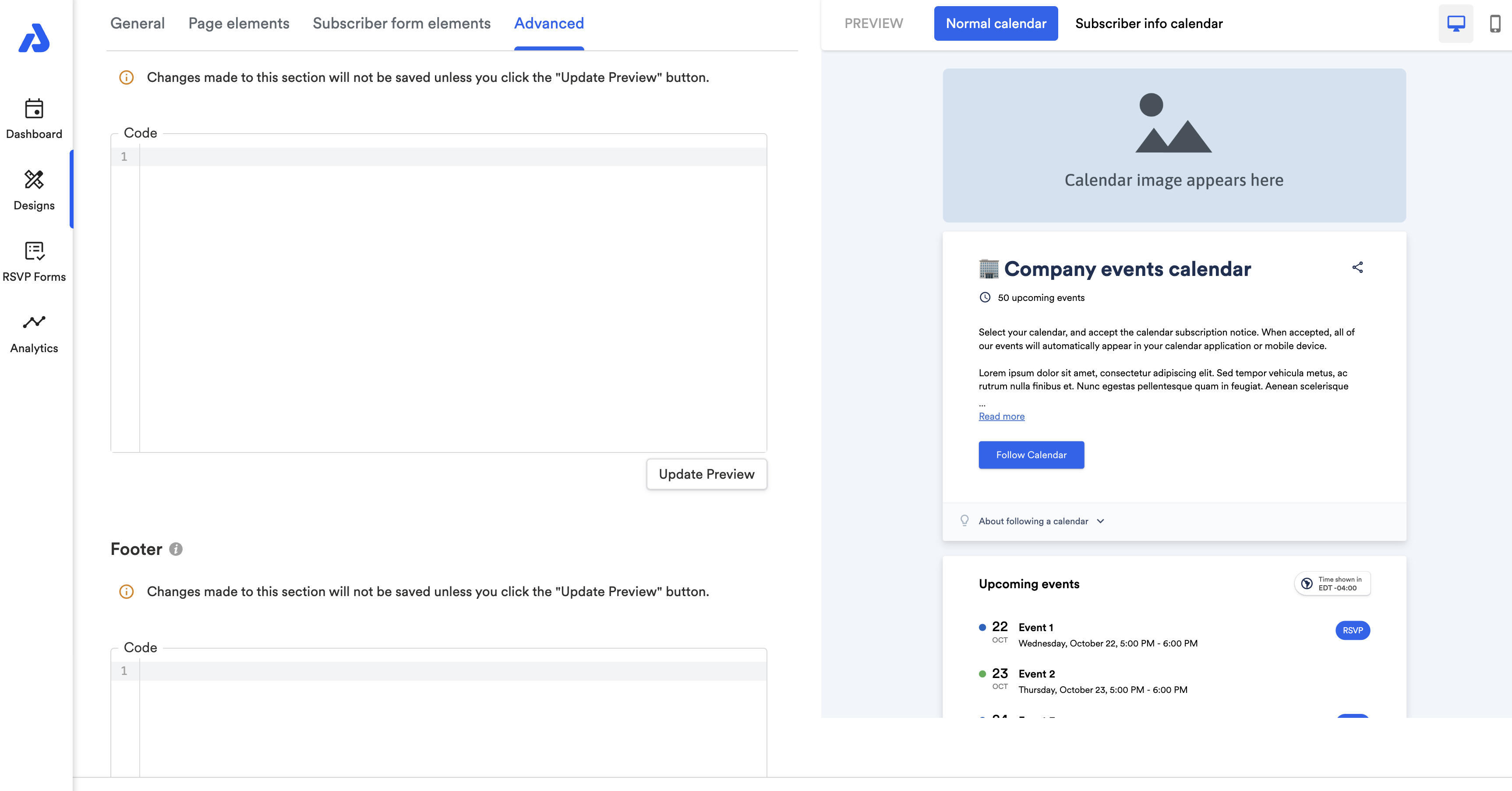 The Advanced tab of the Designs editor is where you can place any custom code that you want to implement on your landing page. For example, you could add in custom CSS that makes changes beyond what the Designs editor allows.