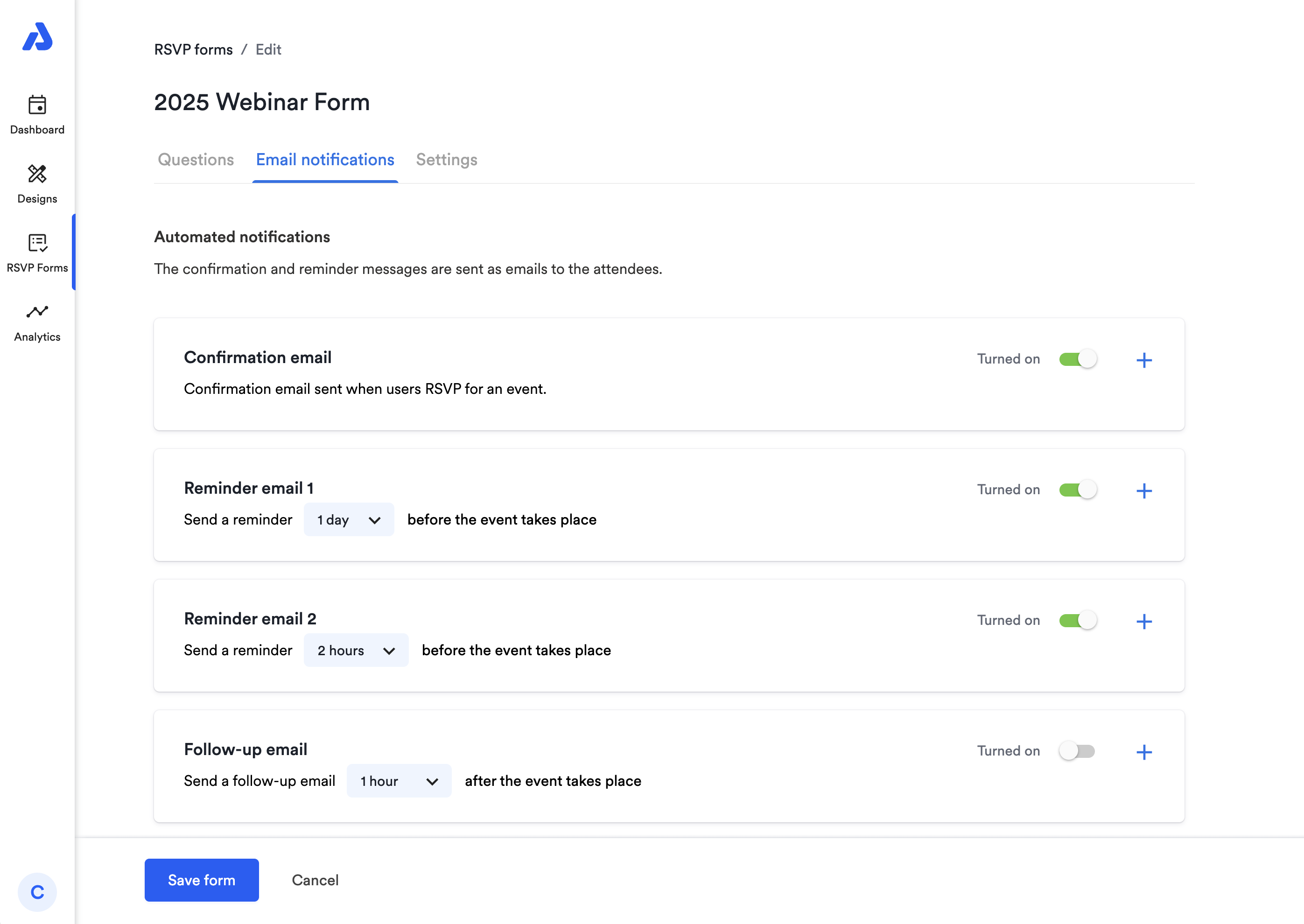 - The follow-up email is disabled by default. It provides you with an opportunity to collect feedback from your attendees after an event. However, please note that the survey link provided in the email is a placeholder—you need to insert your own form and URL if you wish to collect feedback from the follow-up email.