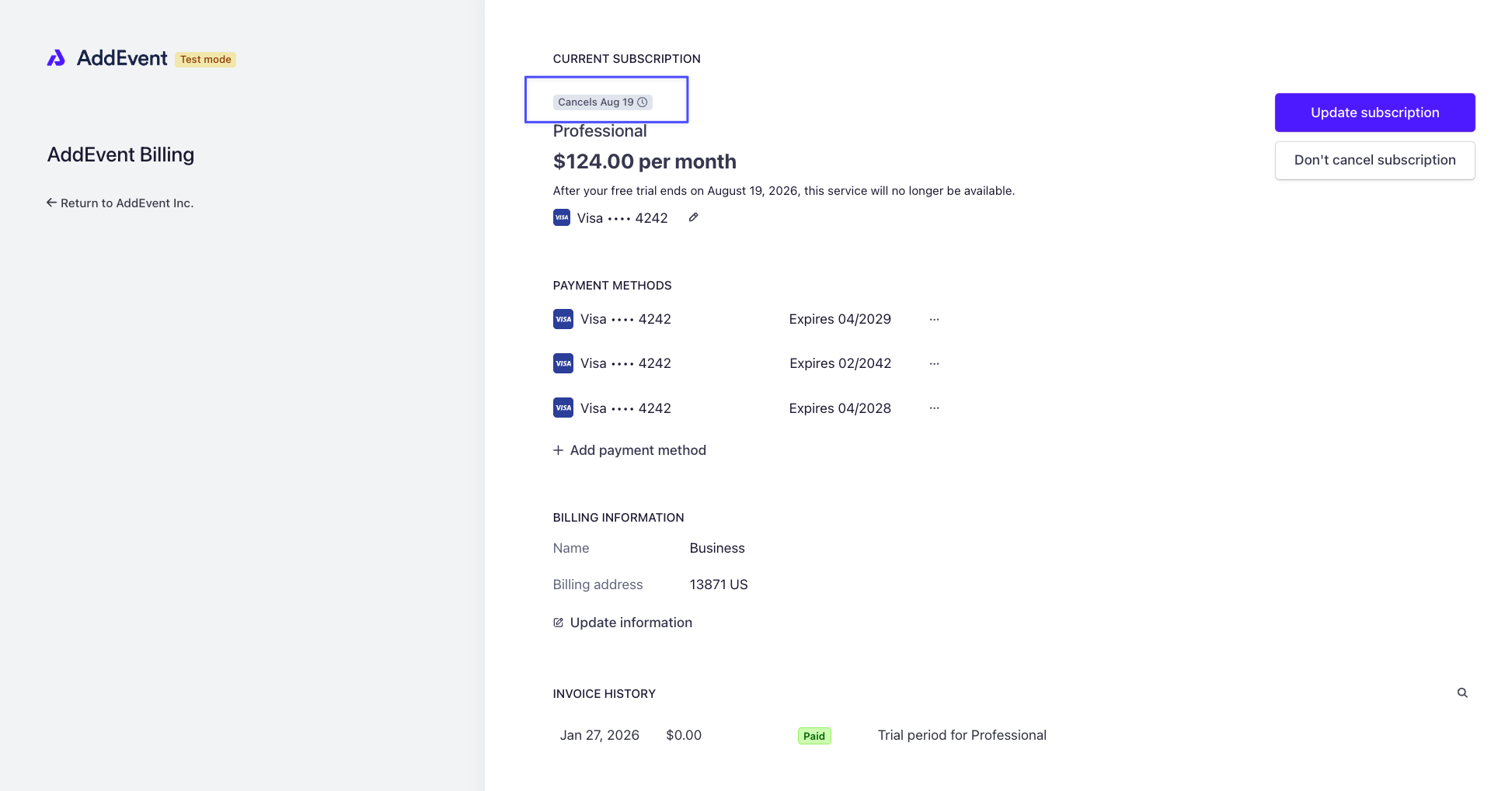 To update your billing information such as the name and billing address, please go to your Account and settings page, then the Billing tab https://dashboard.addevent.com/account/billing: