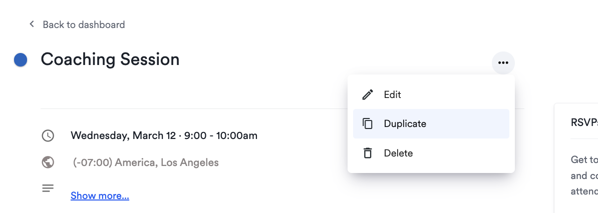 To duplicate an event, click the three dots on the event page.