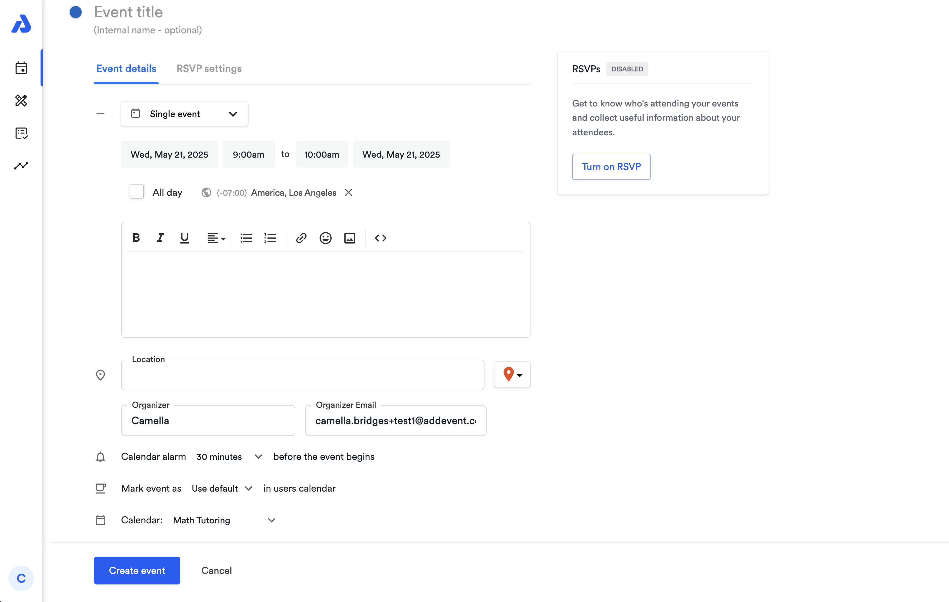 Once you've completed either of the options above, you'll be taken to the Event Creation Page (see image below). From here, you can customize all of the event details. You can click here for a detailed outline of all the event details.