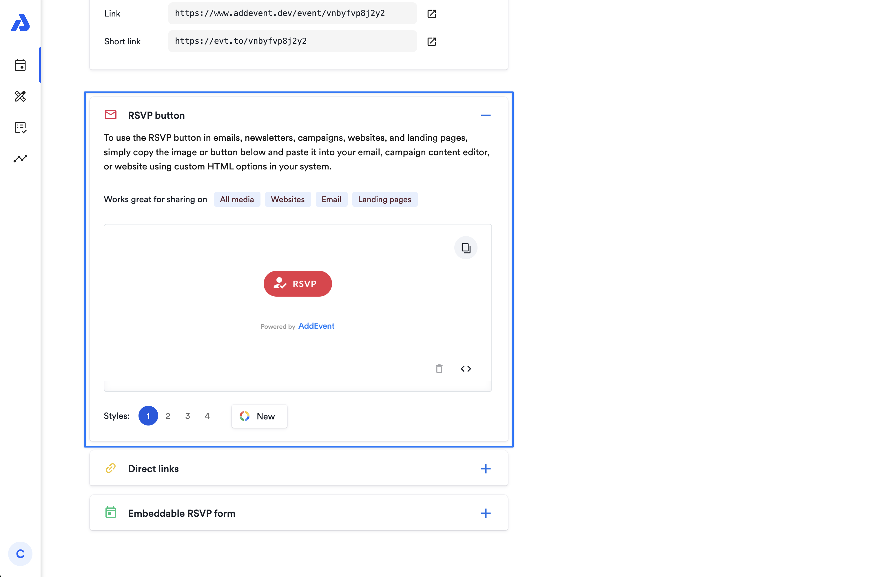 The RSVP button can be copied and added to emails, newsletters, campaigns, and websites! There is only one option (as opposed to both Add to Calendar links and an Add to Calendar button) because, regardless of where your users click the RSVP button from (website or email, for example), they will be directed to the RSVP event landing page to RSVP for your event.