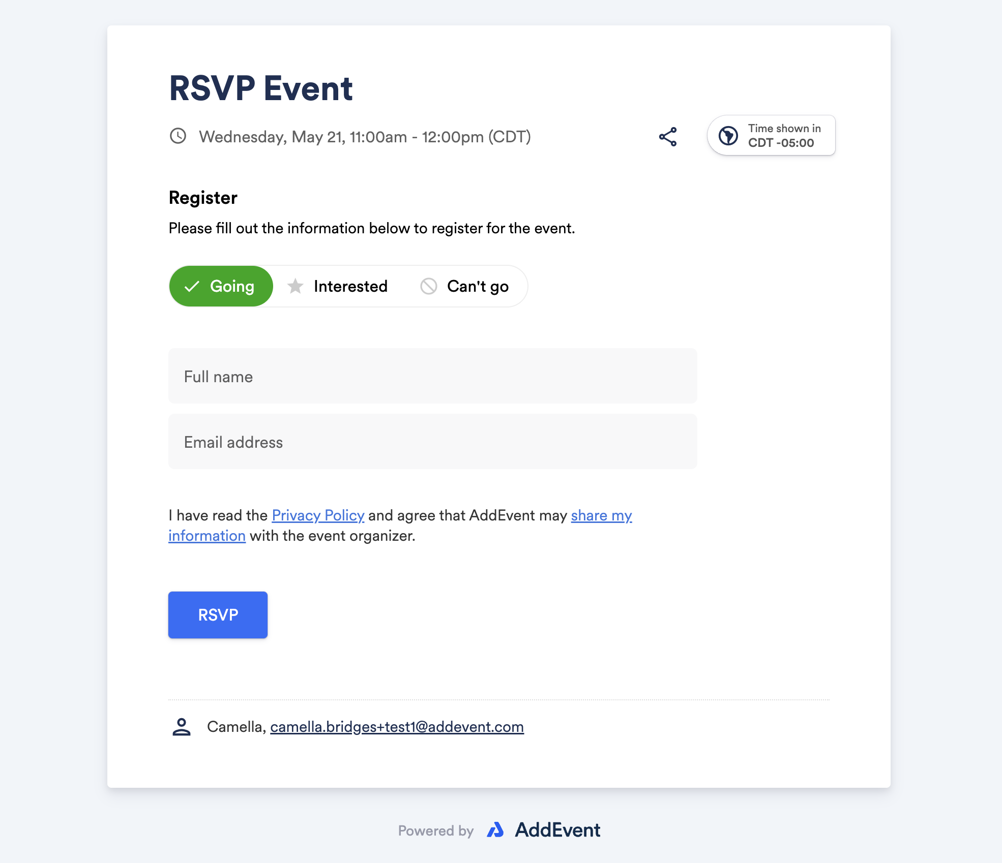 - Click RSVP and see a registration form. The event attendees will fill out the form and click RSVP, where they will then be presented with an Add to Calendar button to save your event to their calendar.