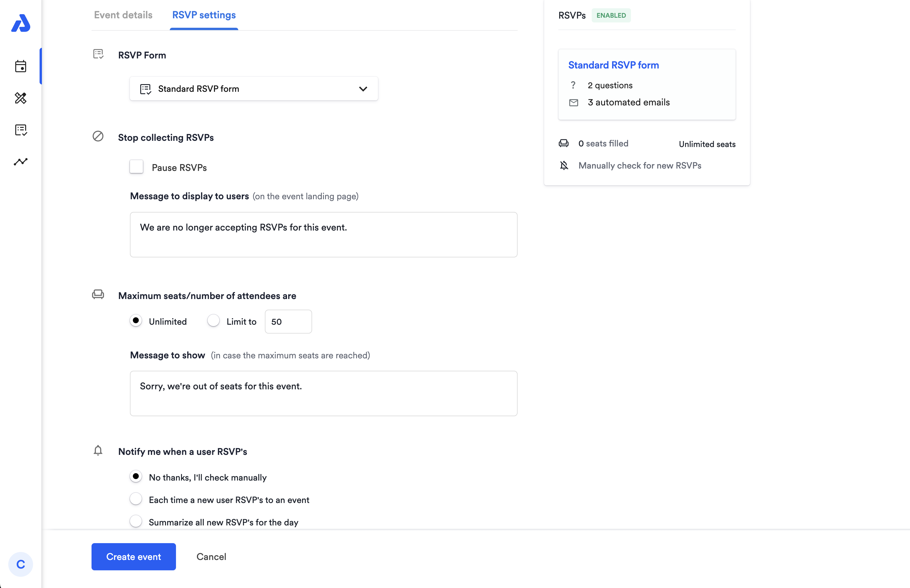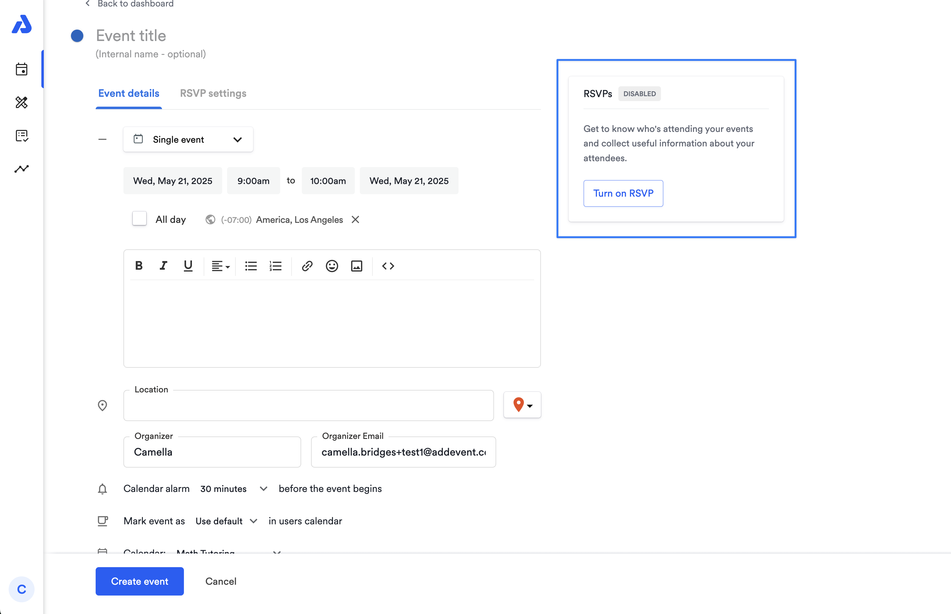 From your event creation page, you can enable RSVP by clicking the turn on RSVP button. The RSVP settings tab will automatically open. Fill out the RSVP settings details and the event details. Once the required event details are filled out, click Create event, and you will be taken to the event details page!