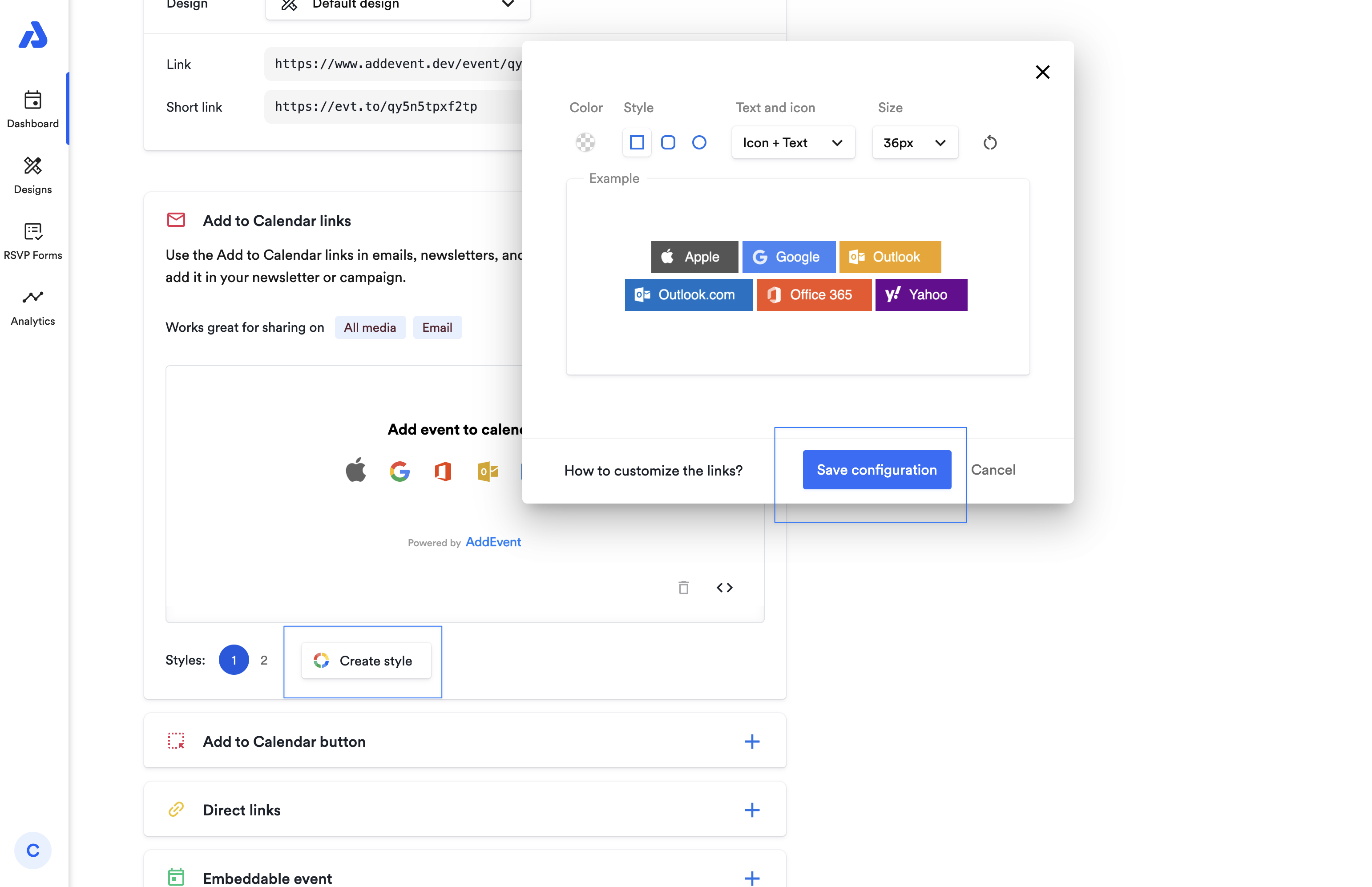 Once you've customized the button to your preferences, click Save configuration to save your custom add to calendar link style.