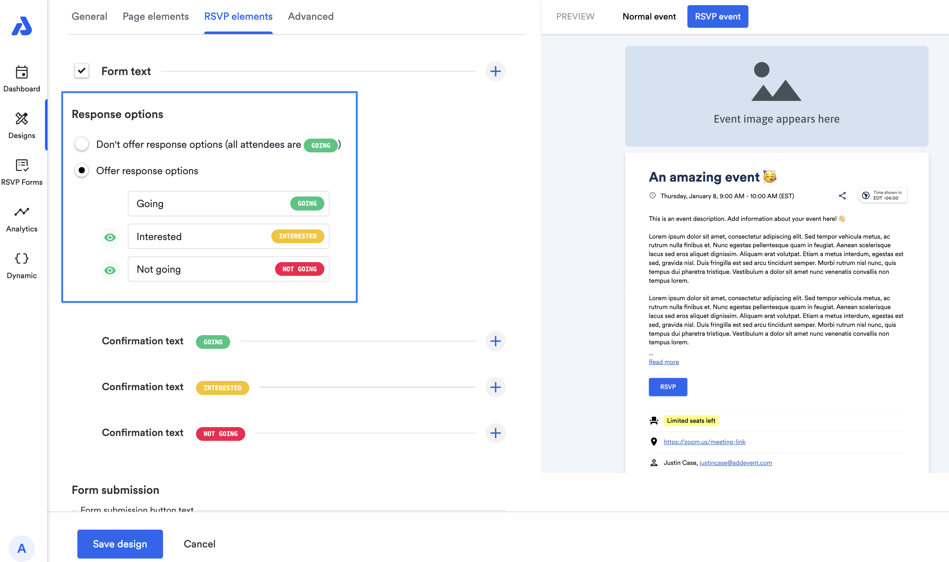 To change the response options for your RSVP event, start on the event landing page design template page and edit or create a new template.