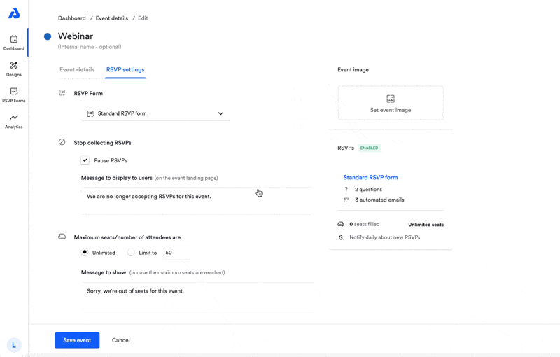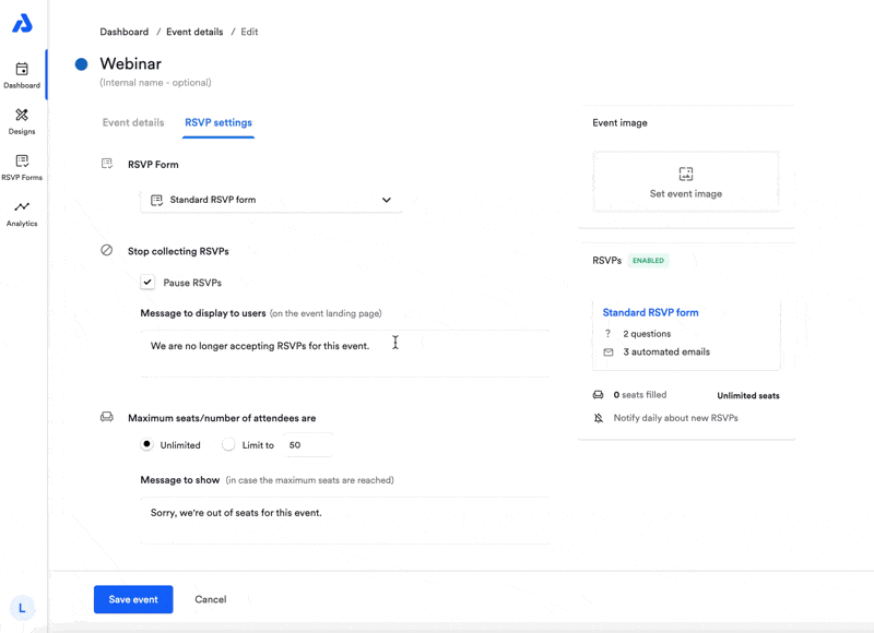 If you need to set a limit on the number of attendees, see here for instructions on adding a seat limit to your event.
