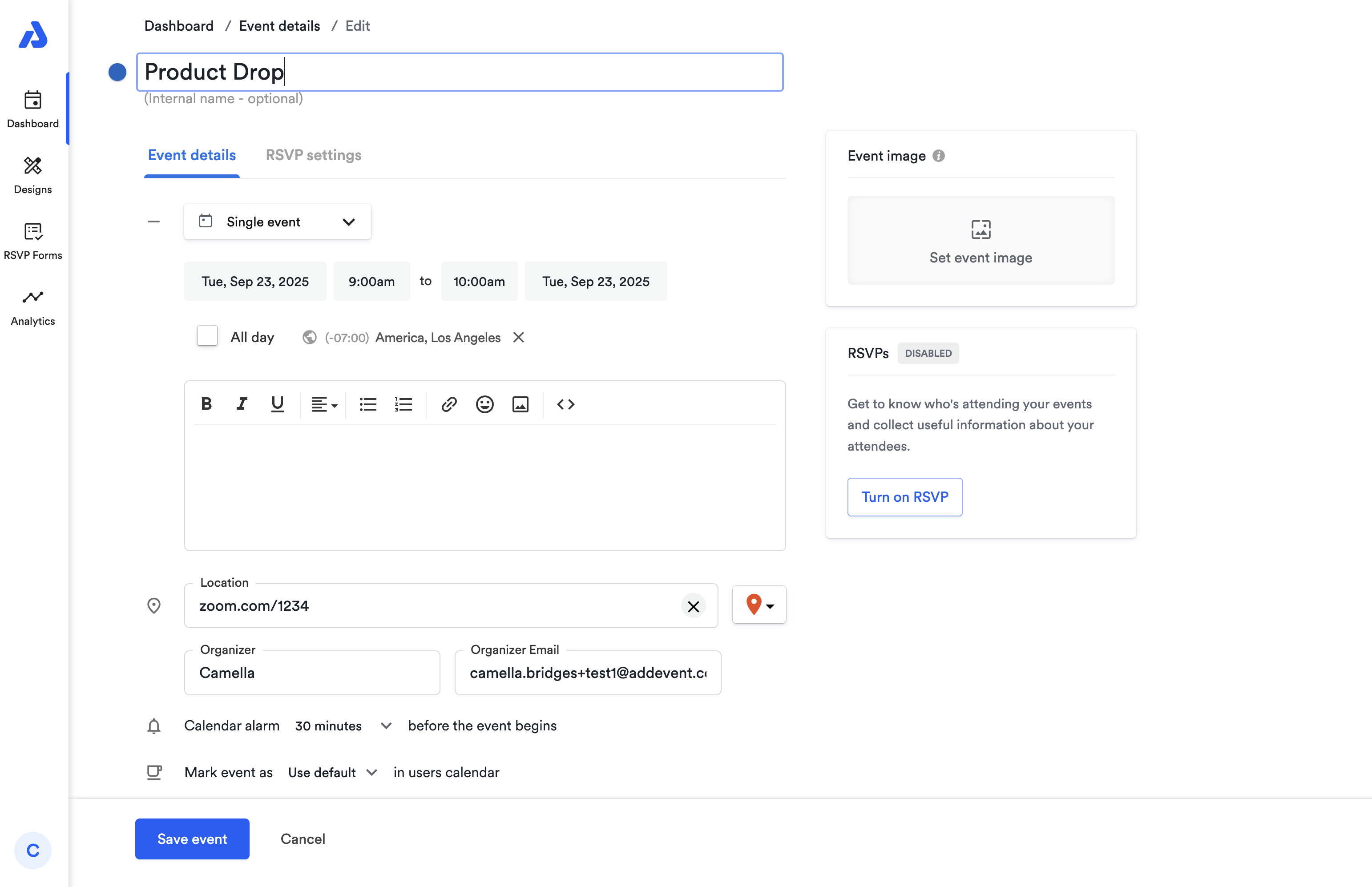 This help doc explains how to edit an event and what can be edited on the edit page. Editing an event in AddEvent allows you to adjust all key details of the event, including its title, date, time, location, and RSVP settings. Follow the instructions below to access the event editing page and learn what can be updated on the page.