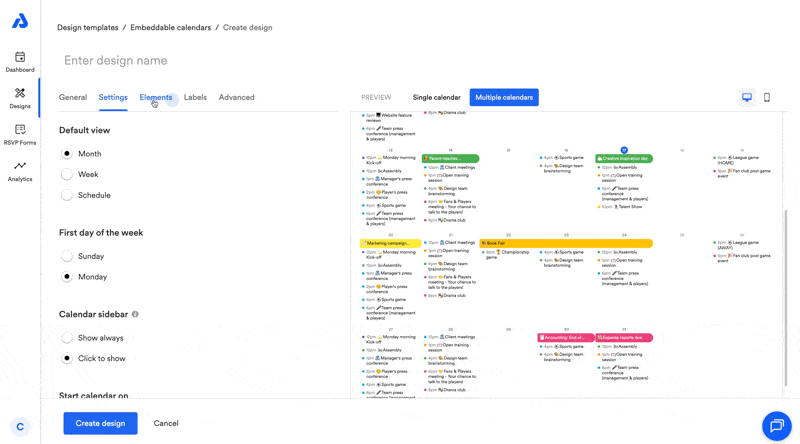 The Elements tab lets you control individual elements of your embedded calendar. You can turn elements on or off and adjust labels, images, and colors to match your organization’s branding.