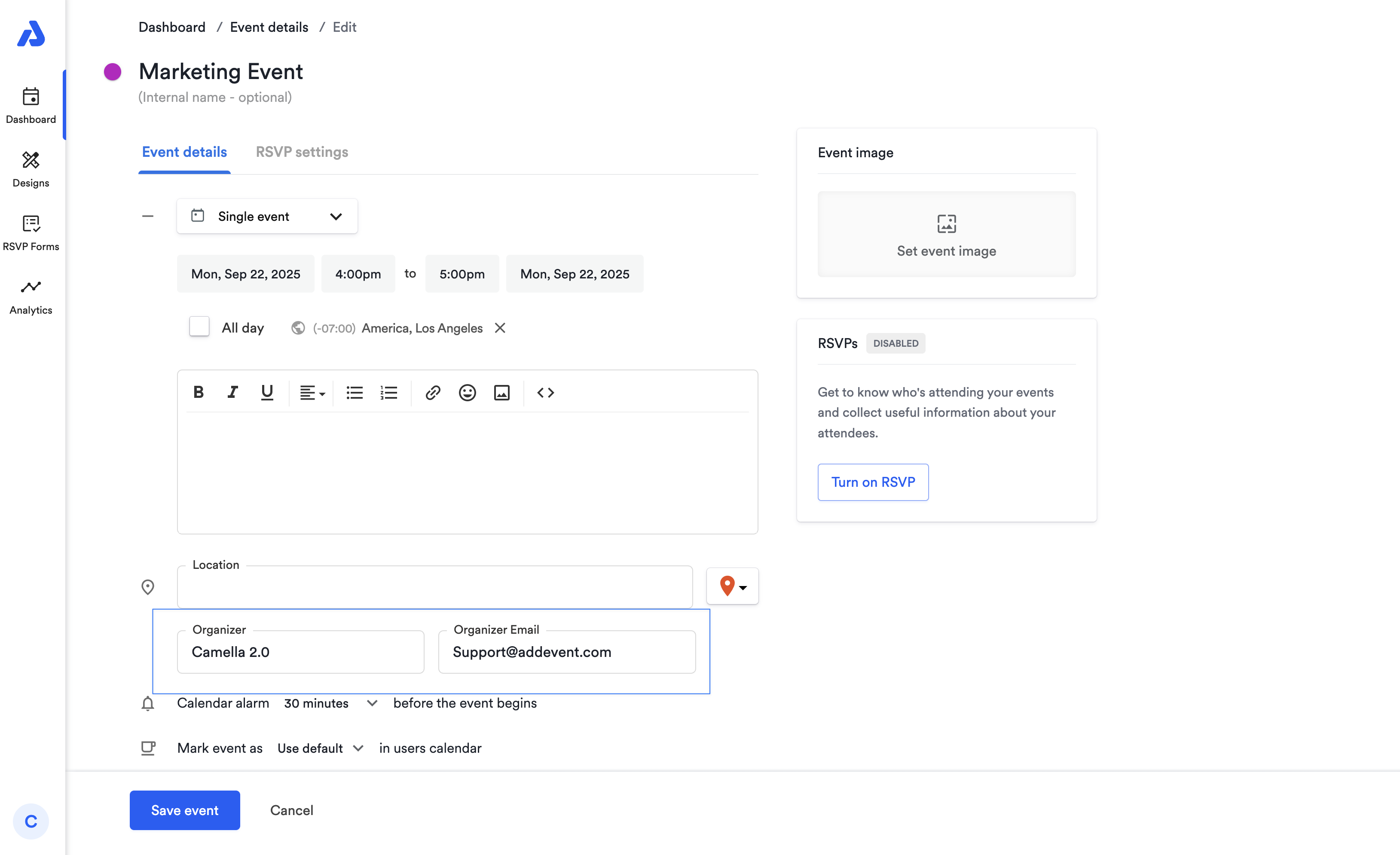 Edit an event to update the current organizer's name and email. To edit an existing event, follow the steps below: