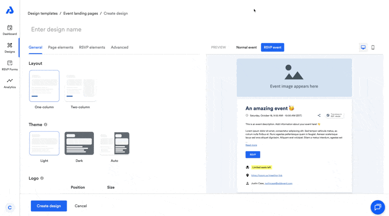 The General tab contains settings for layout, images, and colors. Use these options to align your event landing page with your organization’s branding