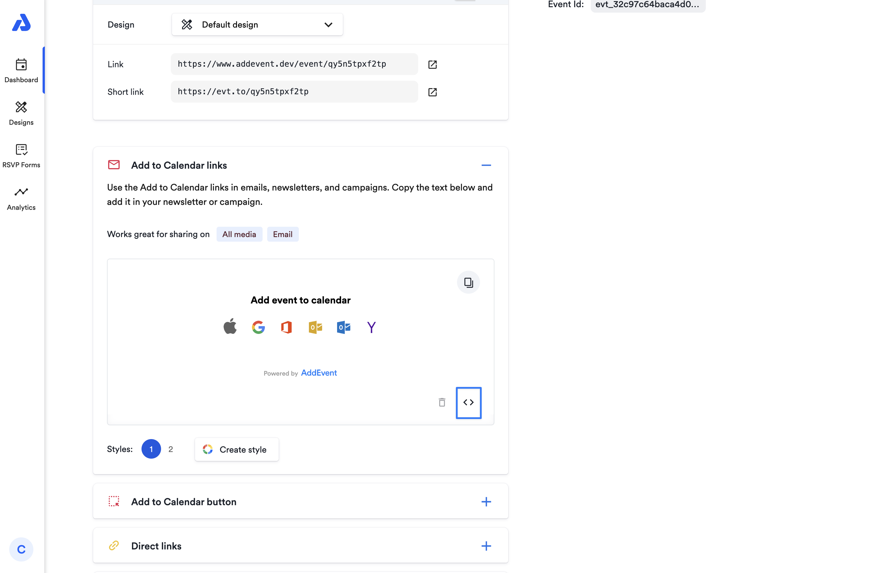 Go to the Event Page for your event, and copy the link code by clicking the <> button.