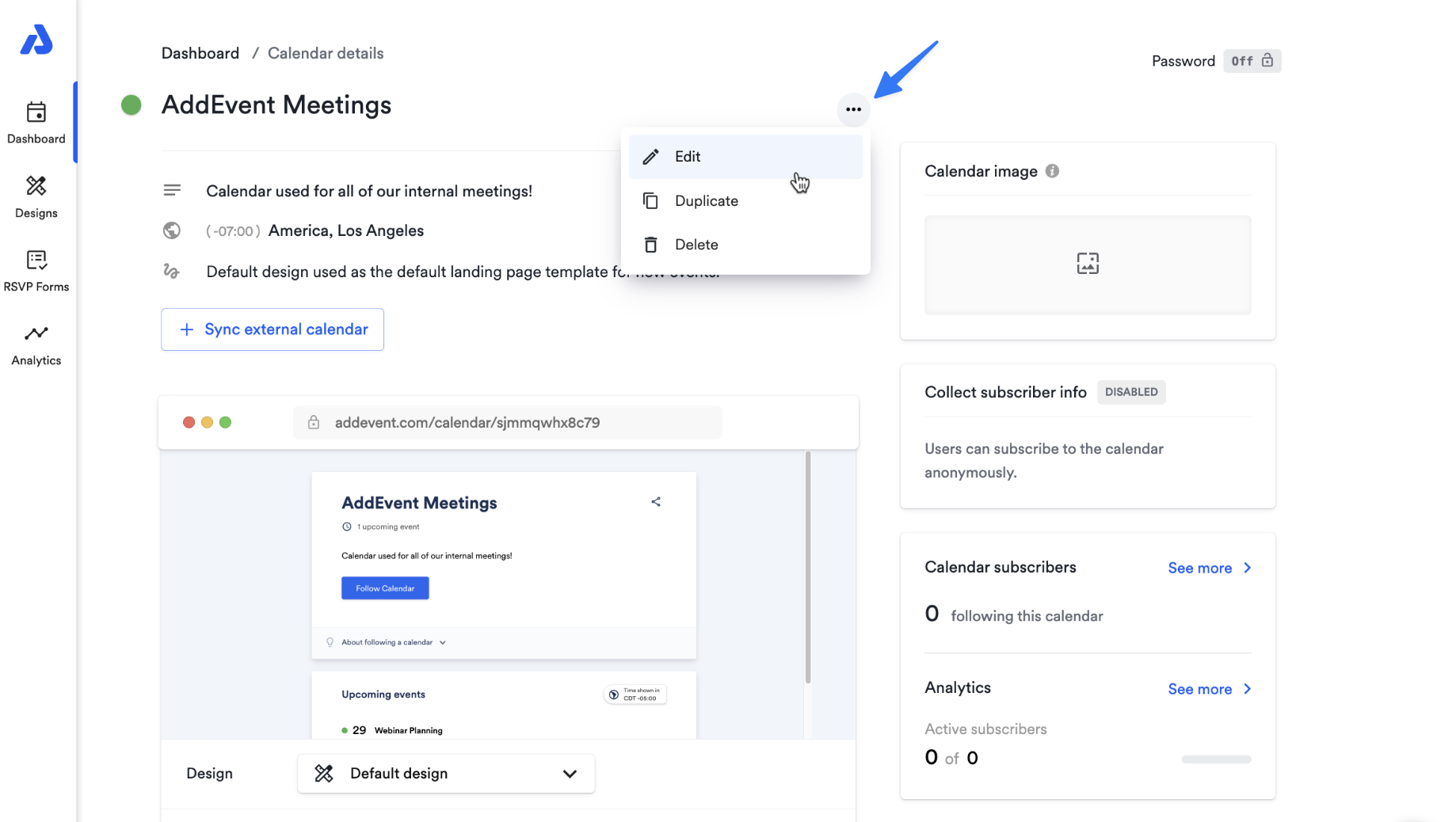 From the calendar details page, select the three dots icon located to the right of the calendar's title, and then click "Edit".