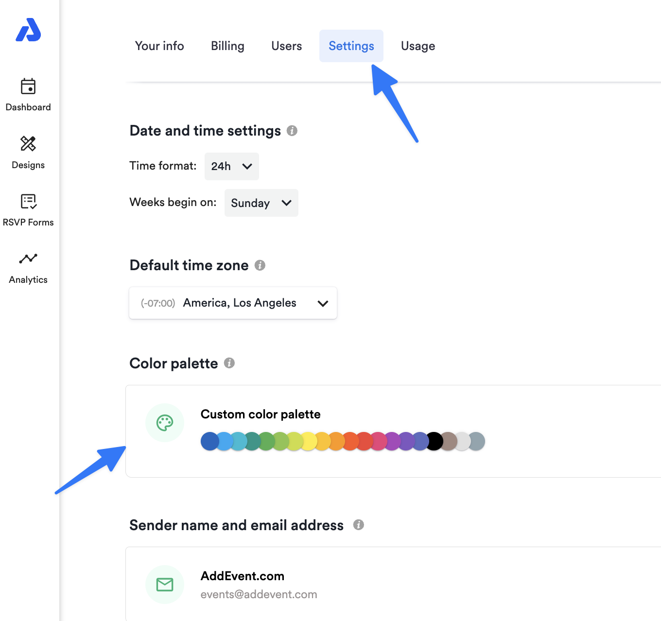 In your Account settings, you will find under the "Settings" tab an option to save a custom color palette. These colors can be applied to any calendar or event. Below is an example where the color palette can be found: