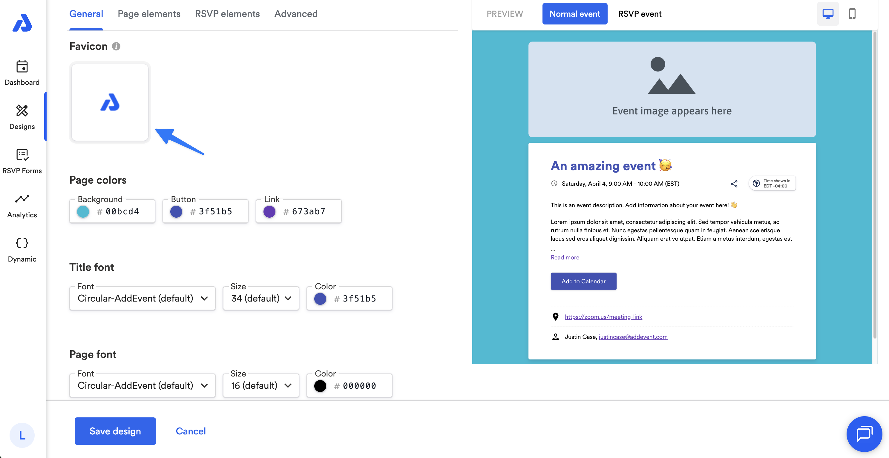 You can include your own brand's favicon for your event landing pages by using an event landing page design template.