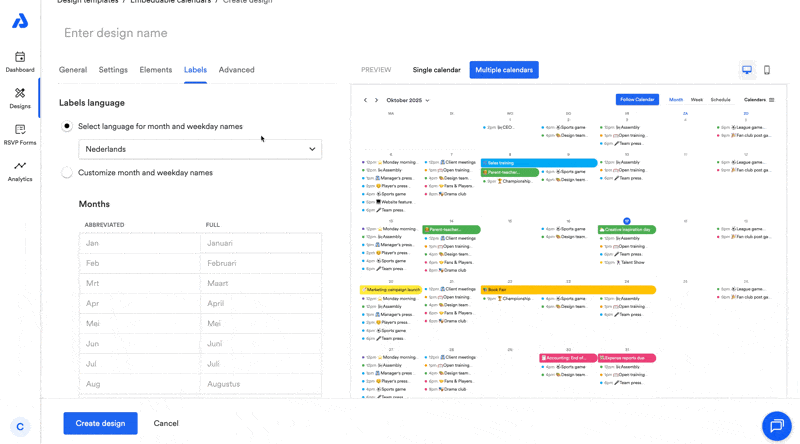 The Labels Language section lets you customize the language and text for months, weekdays, and other calendar elements. By default, labels are in English (US), but you can select a pre-translated language or edit labels manually.