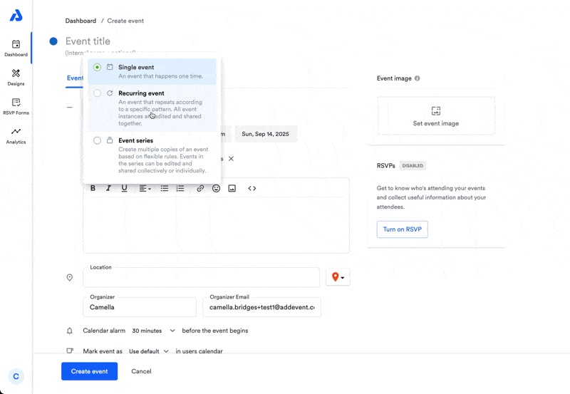 - Select the dropdown that says "single event" to see the list of event types and select recurring event.