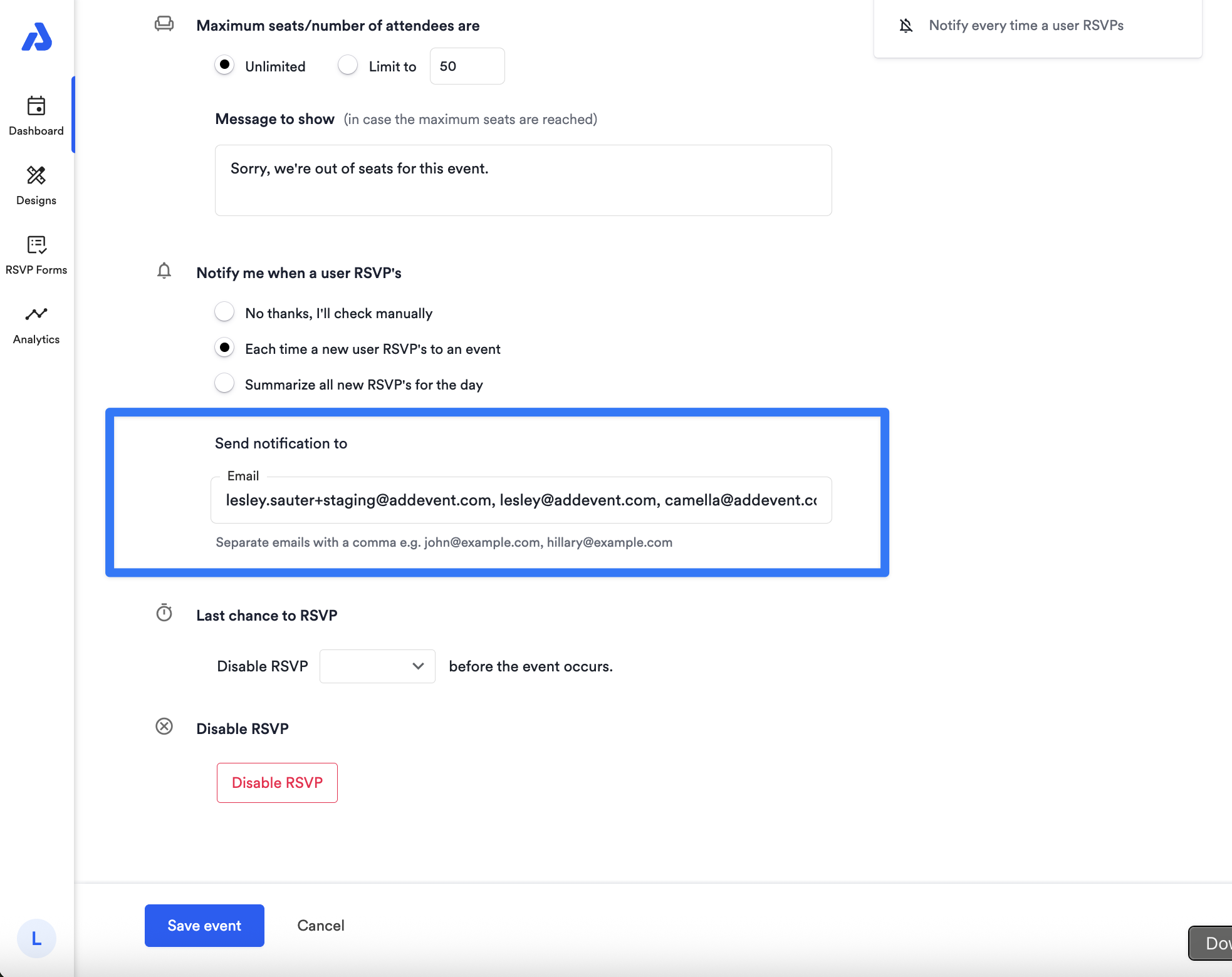 If you select Each time a new user RSVP's to an event or Summarize all new RSVP's for the day notifications, you’ll need to enter at least one email address in the Send notification to section to receive these emails. You can enter multiple email addresses, separating them with commas.