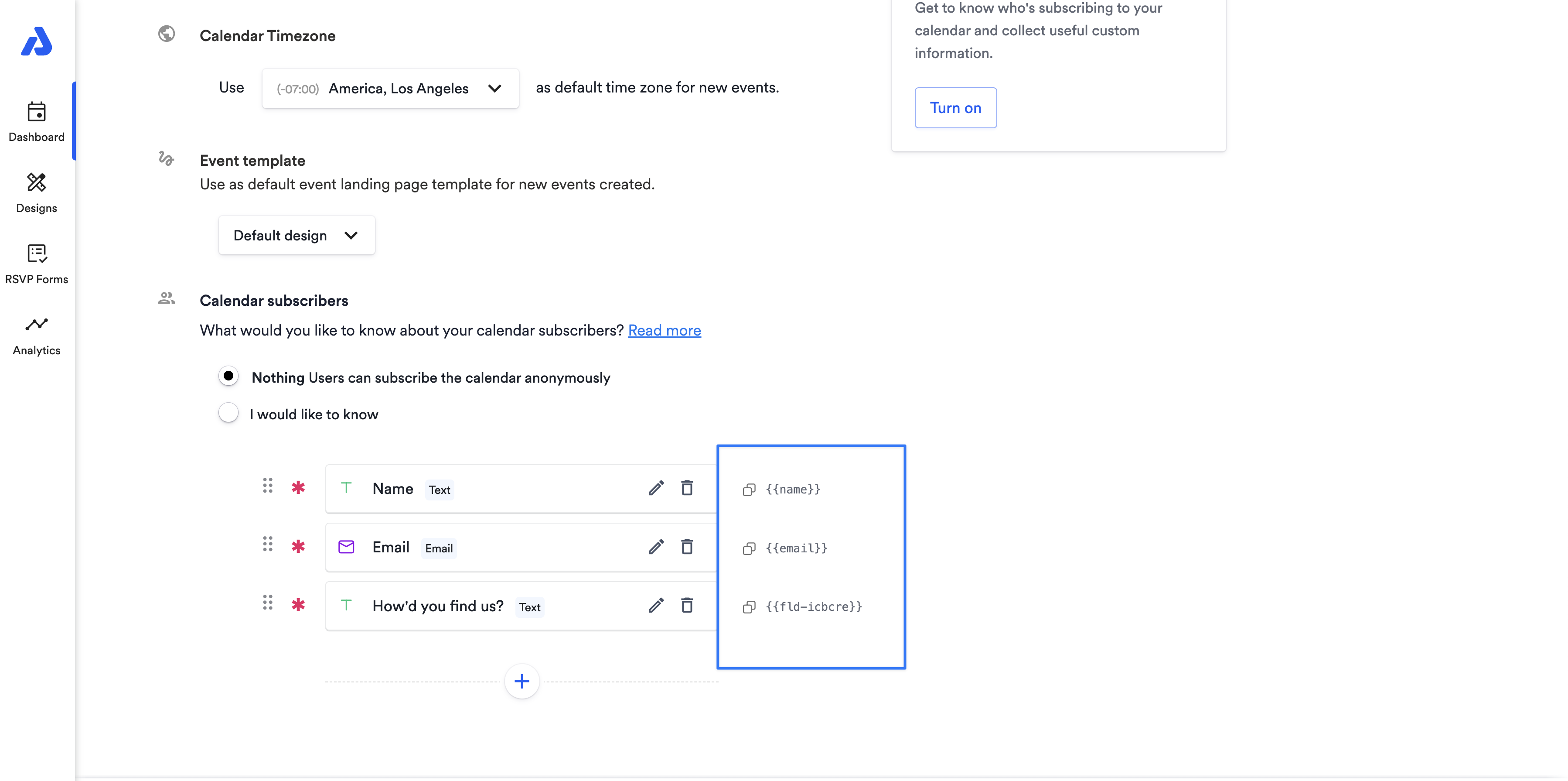When sharing an RSVP event or a calendar that requires users to enter their information before subscribing, you might already have that user's information. To improve the user experience and ensure that they don't have to re-enter that information when RSVPing to your event or subscribing to your calendar, you can pass that user information through to the event or calendar landing page so that the information is pre-filled when the user lands on the page. A common use case for this is when sending emails from a CRM/email marketing platform - you can use merge tags/personalization tokens to update the information for each user.