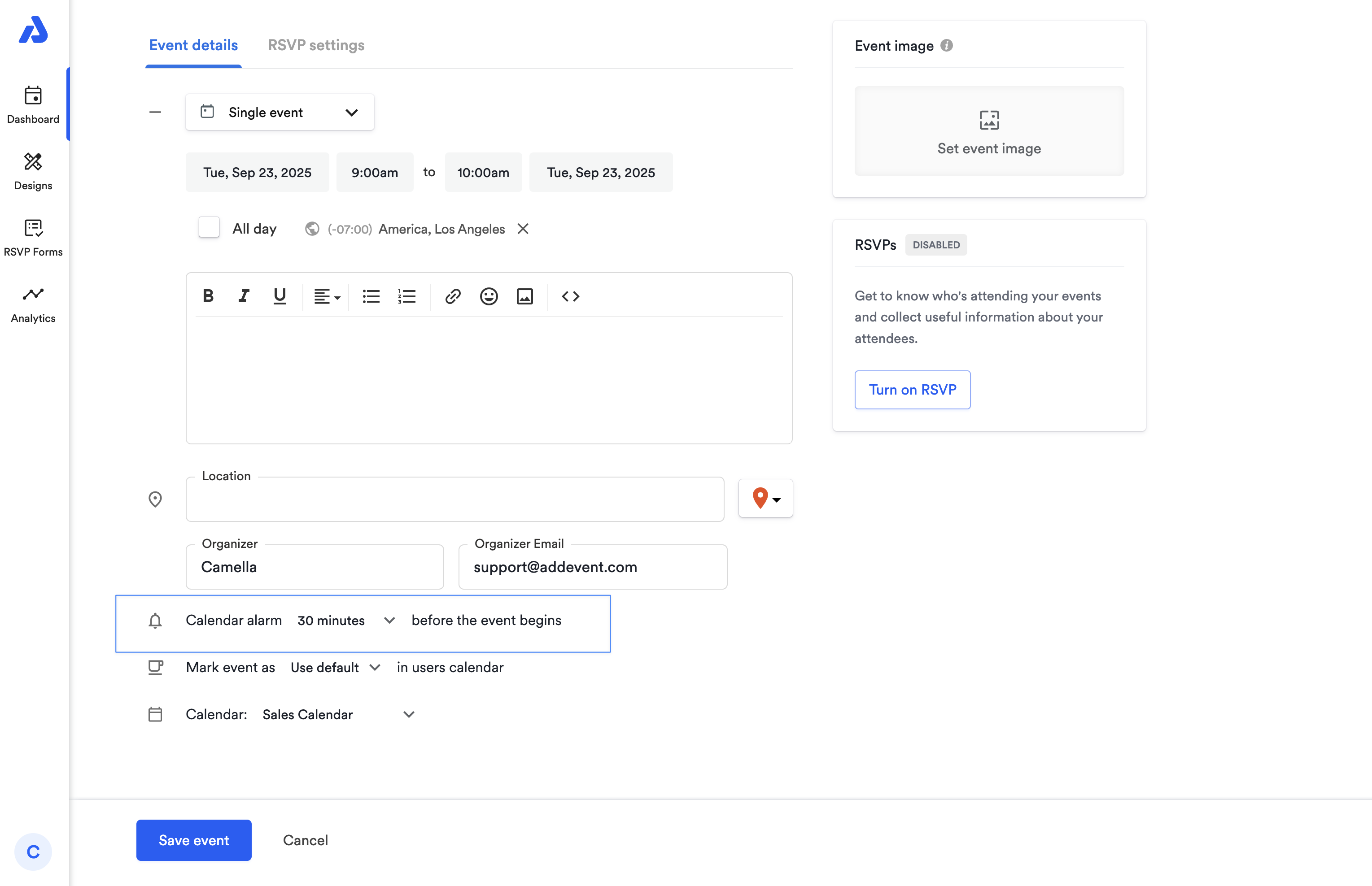 With AddEvent, you may allow one calendar push notification per event. Calendar push notifications depend on the attendee’s calendar platform and settings. AddEvent lets you enable notifications, but delivery is controlled by the attendee’s calendar service (e.g., Google, Apple). Their personal settings override yours.