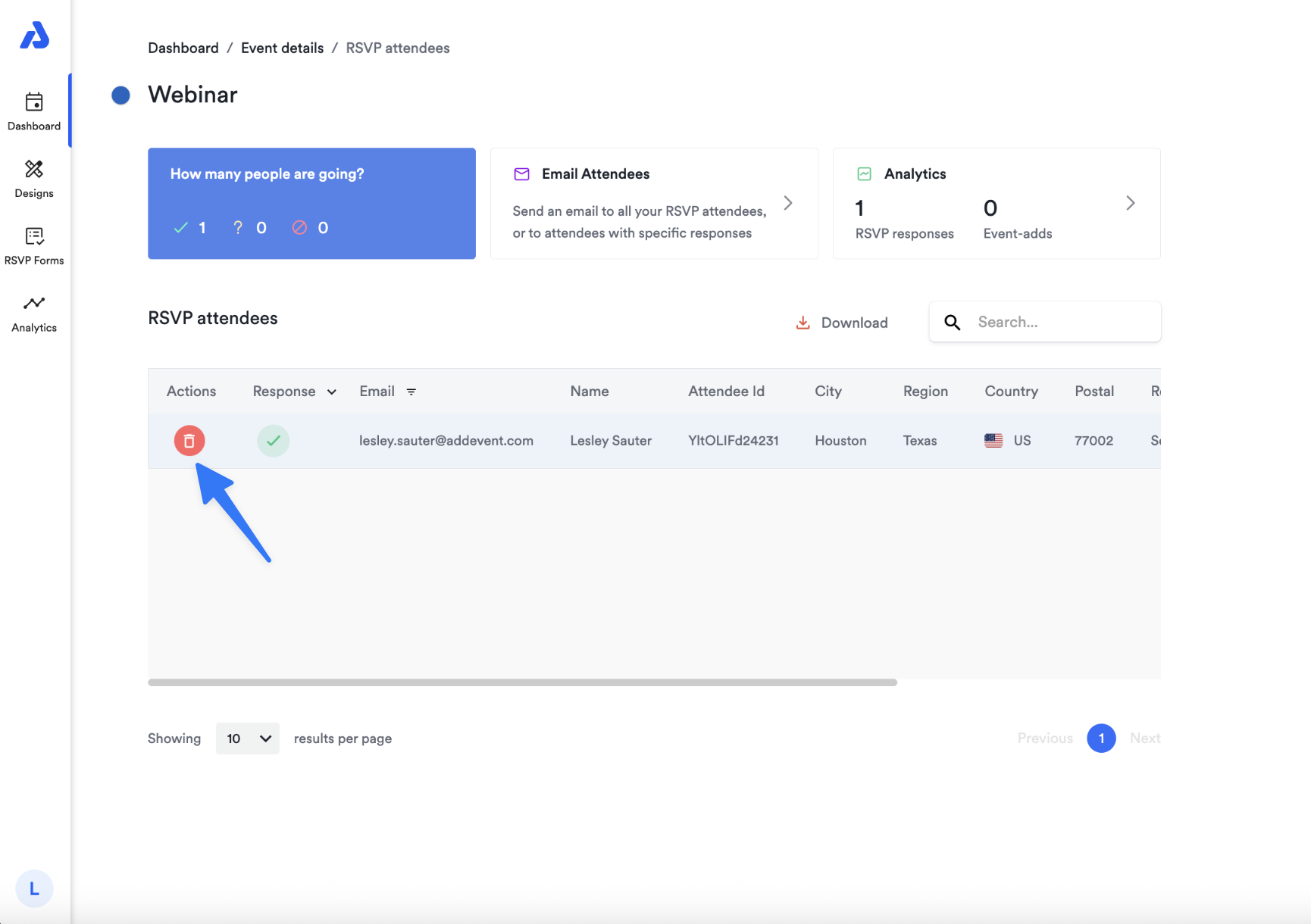 Locate the attendee you want to remove from the list of attendees, and click the Trash Can icon next to the entry you want to delete.