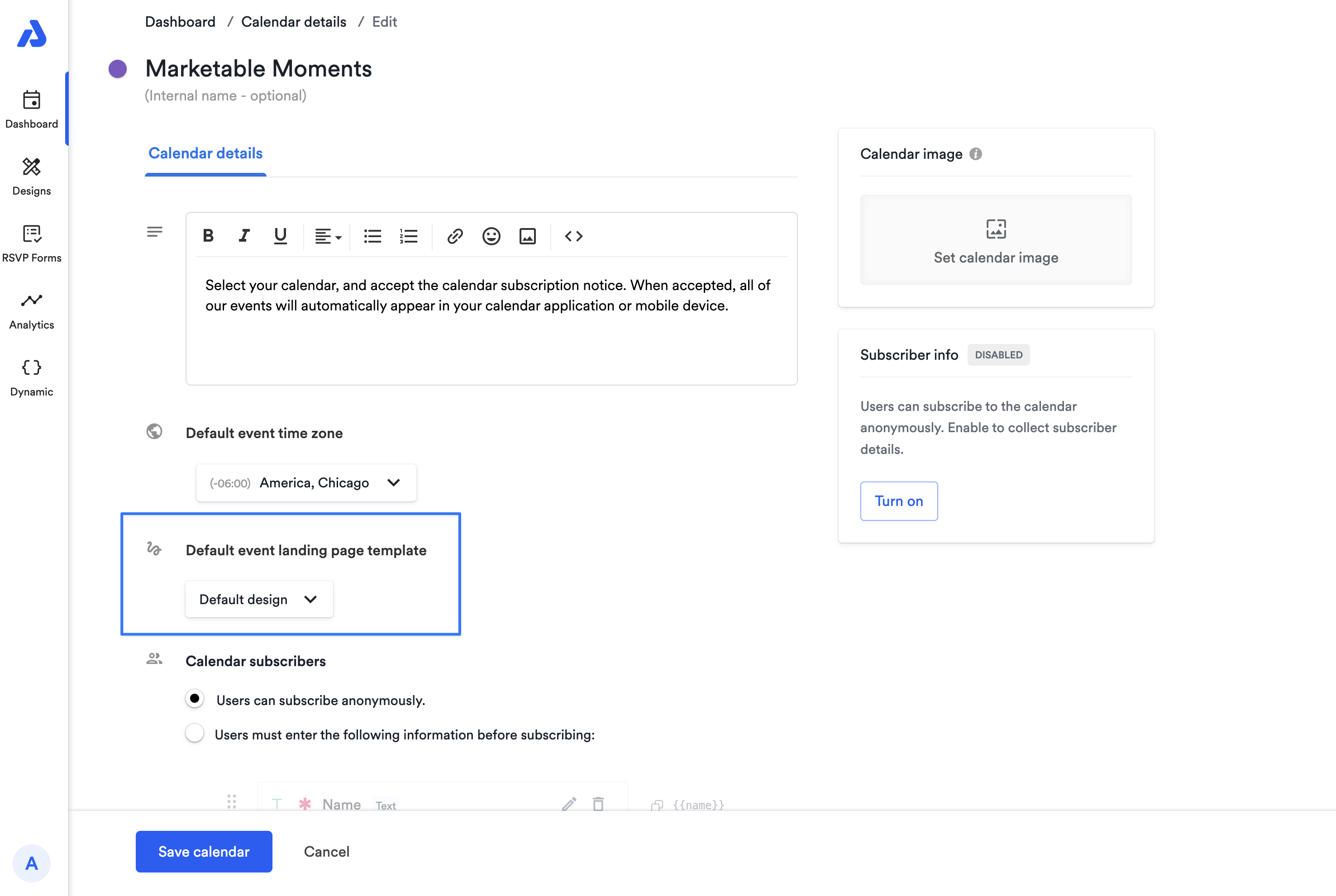 How to Set a Default Event Landing Page Design Template for a Calendar