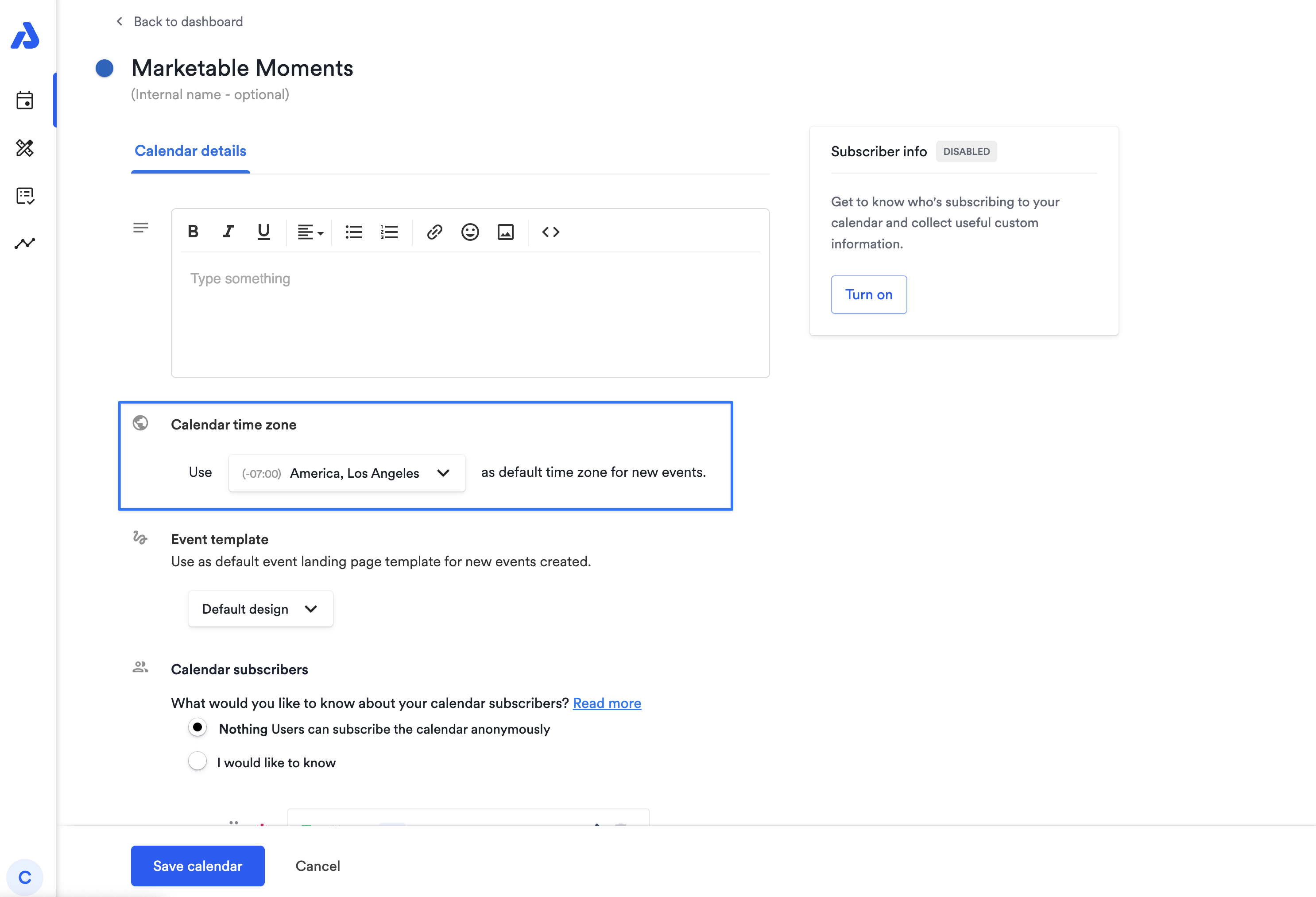 You can assign a default timezone to your calendar so that every event created within it automatically uses this timezone. This setting helps keep events consistent for viewers in specific locations, but you can still adjust the timezone for individual events as needed.