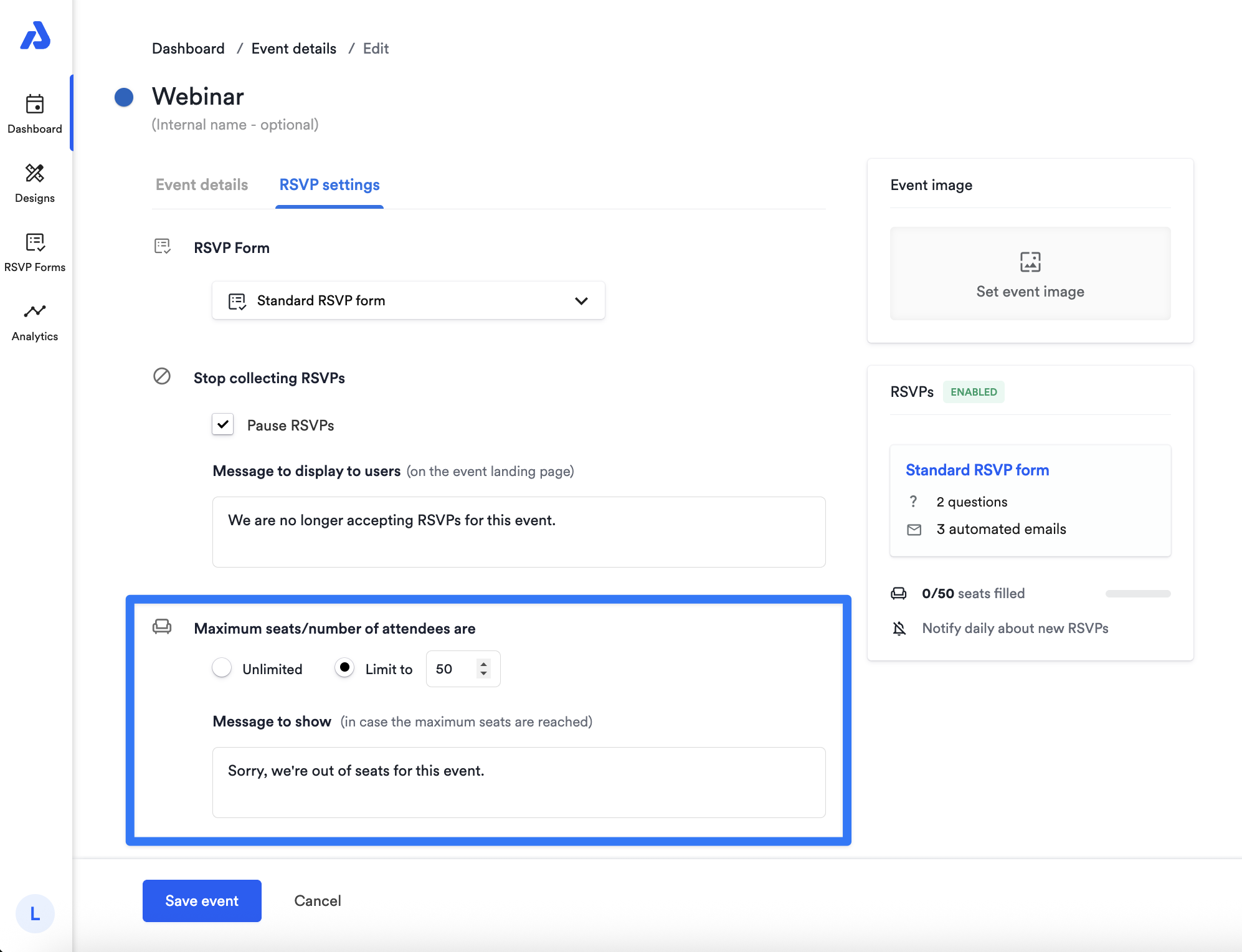 For example, you could enter a message such as: “This event has reached its maximum capacity, and we are no longer accepting RSVPs. Thank you for your interest!”