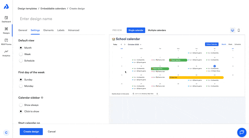 The Settings tab controls how the embedded calendar behaves for end users. Use these options to customize the default view and interactions of your calendar.