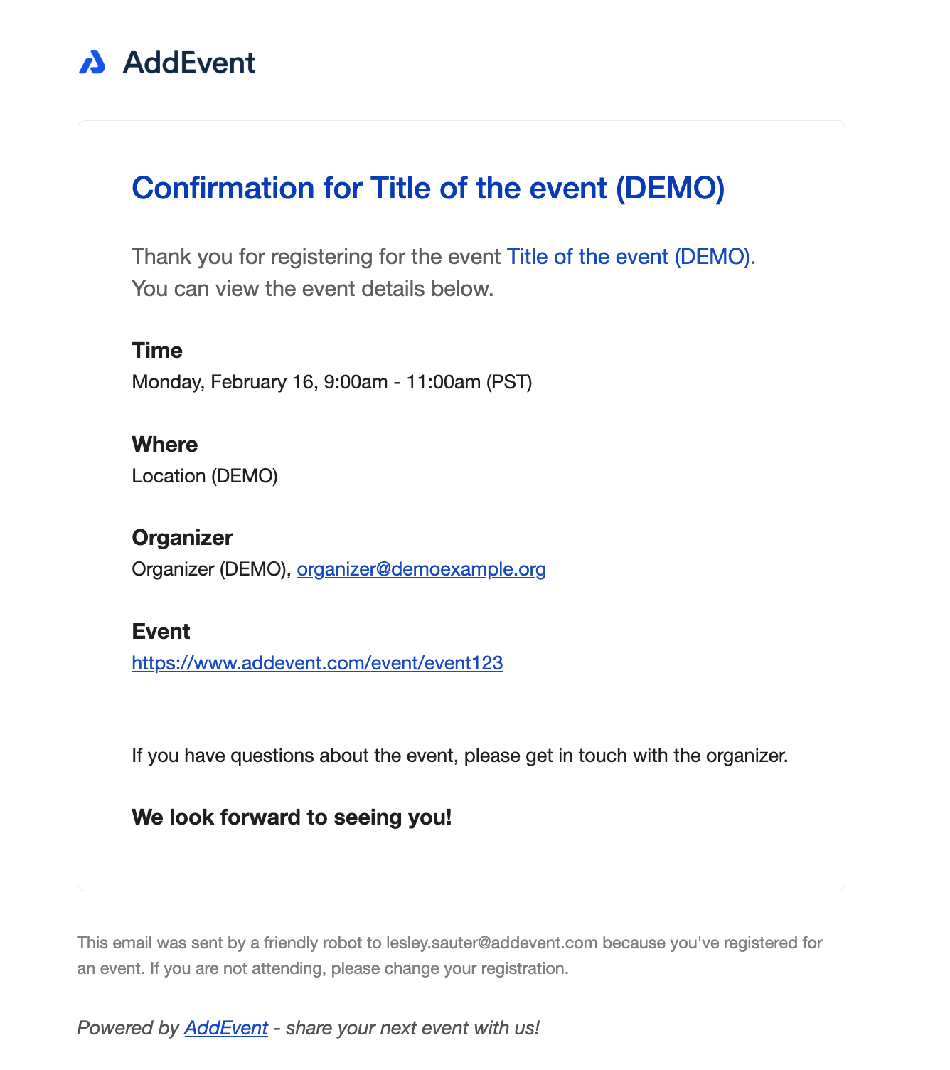 - The event's name in the test email will be "Title of the event (DEMO)".