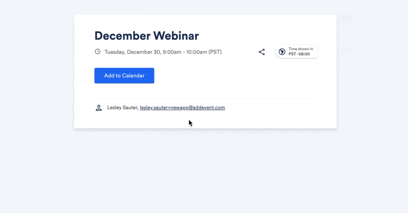 Attendees can use the time zone selector to have the event's time displayed in the timezone of their choice. For example, if they know they will be traveling to another location for the event, they can adjust the timezone to match the timezone of the event destination.