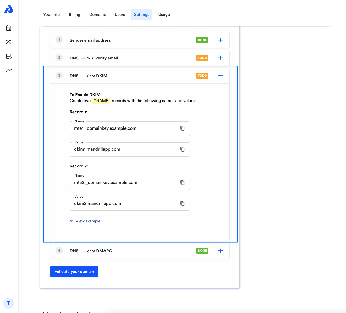 If everything has been configured correctly, the TODO icons on each section will switch to DONE. If any component is misconfigured, the icon will not switch, and we will let you know via an error message that something is not set up properly.