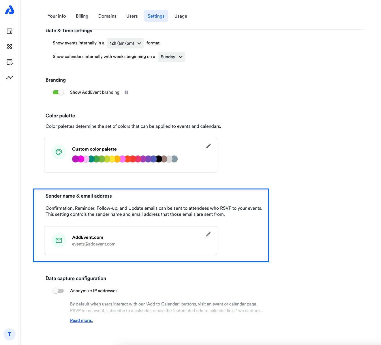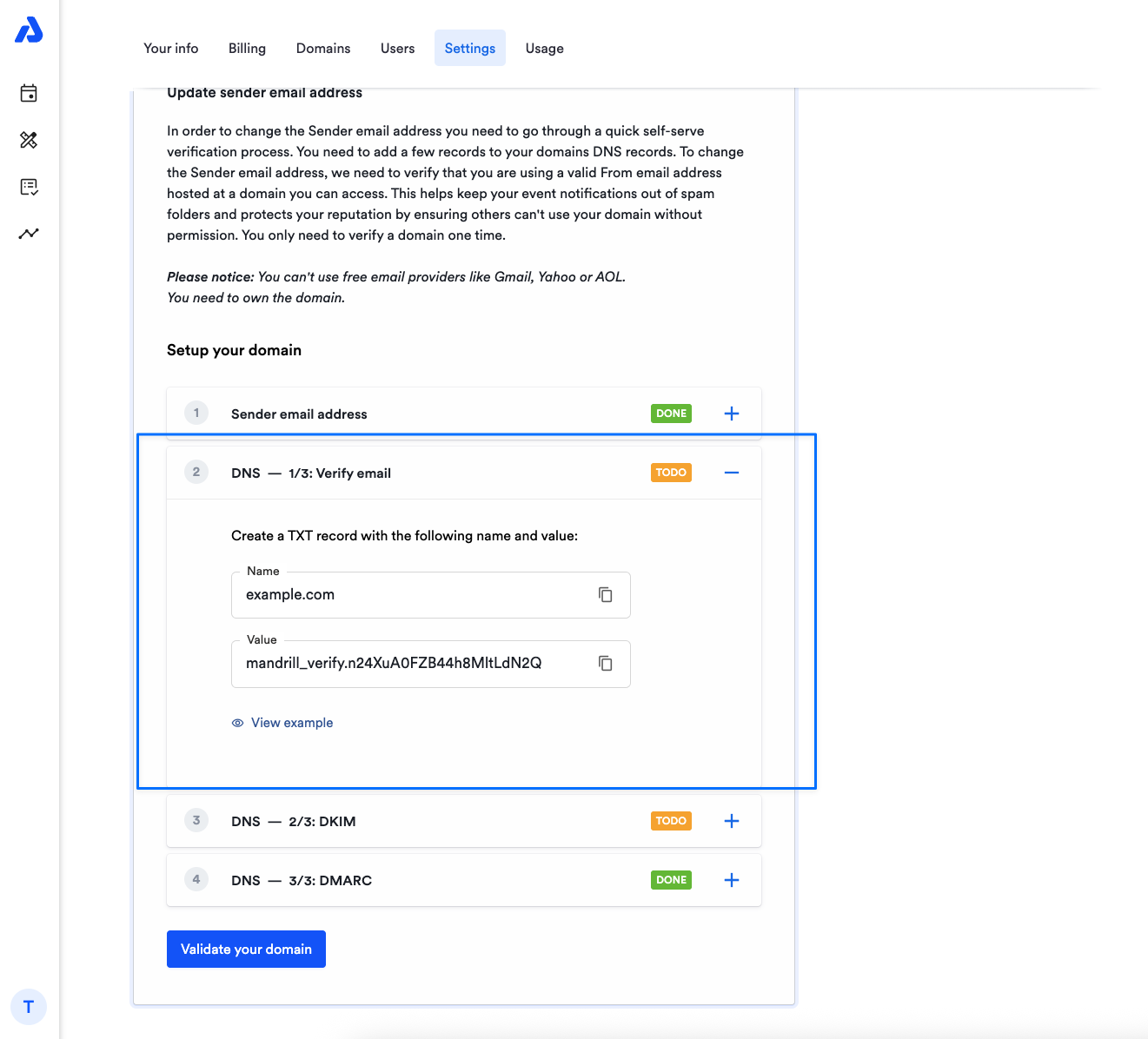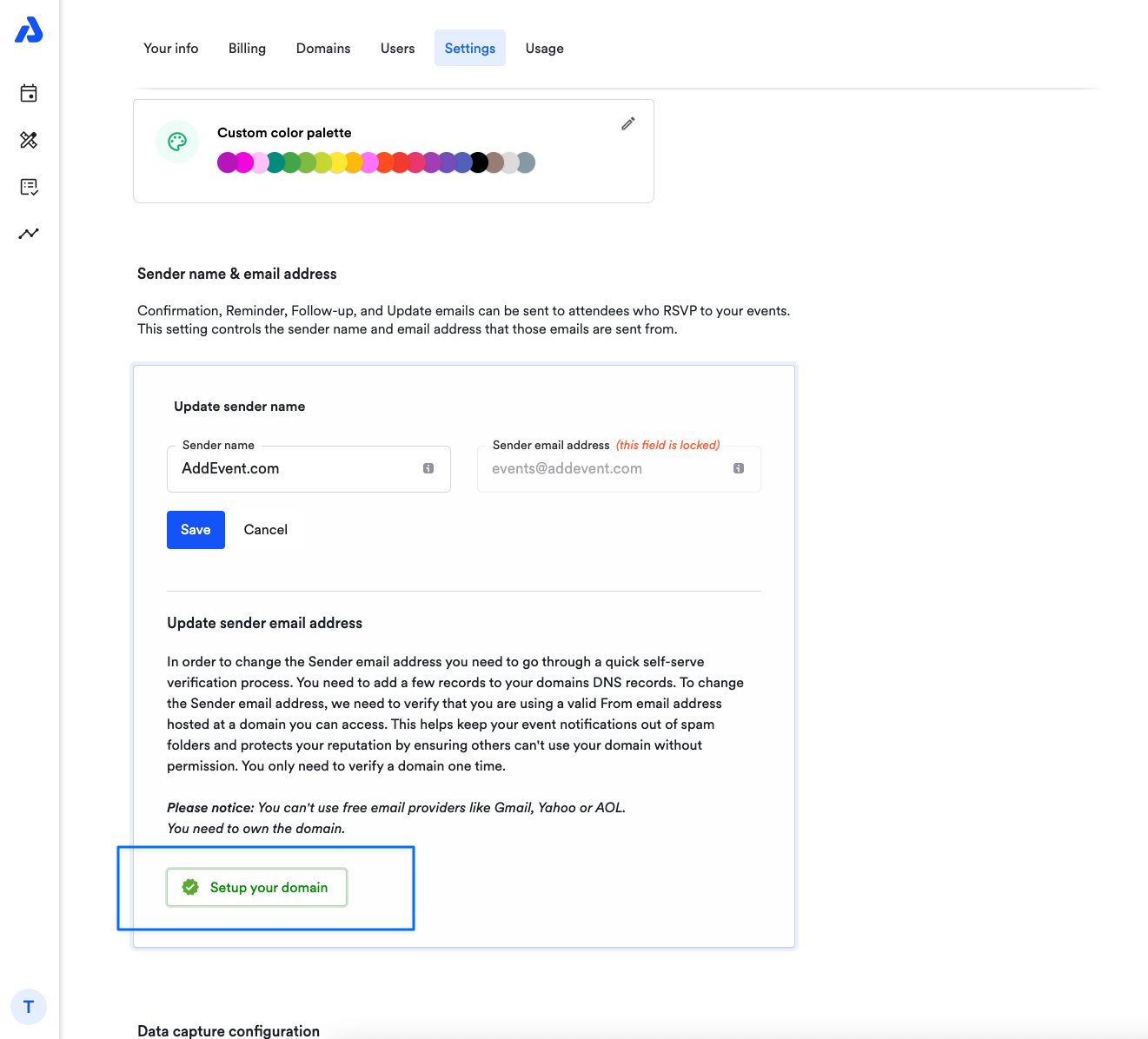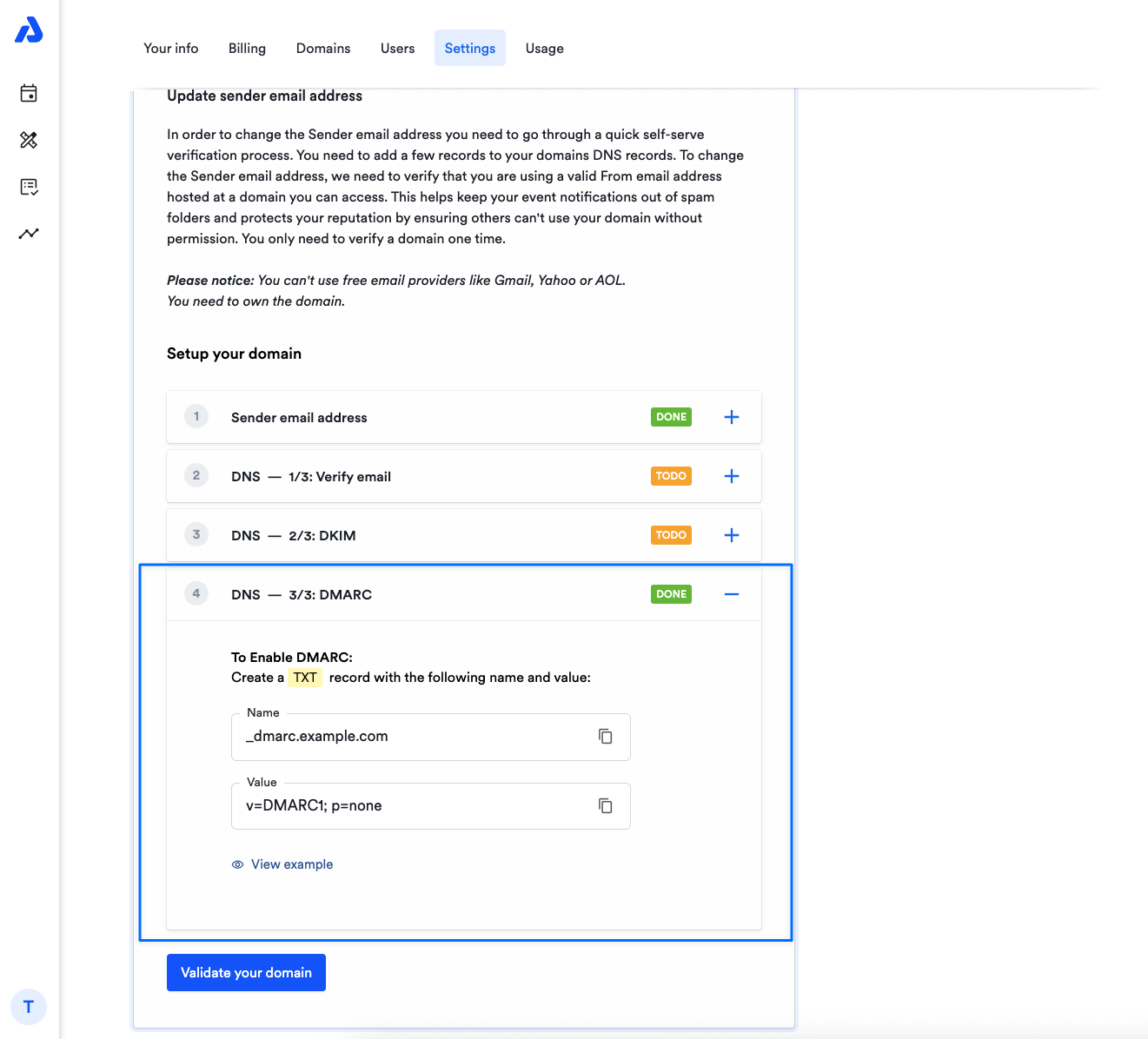 In order to change the Sender email address, you need to go through a quick self-serve verification process. You need to add a few records to your domain's DNS records. To change the Sender email address, we need to verify that you are using a valid From email address hosted at a domain you can access. This helps keep your event notifications out of spam folders and protects your reputation by ensuring others can't use your domain without permission. You only need to verify a domain once.