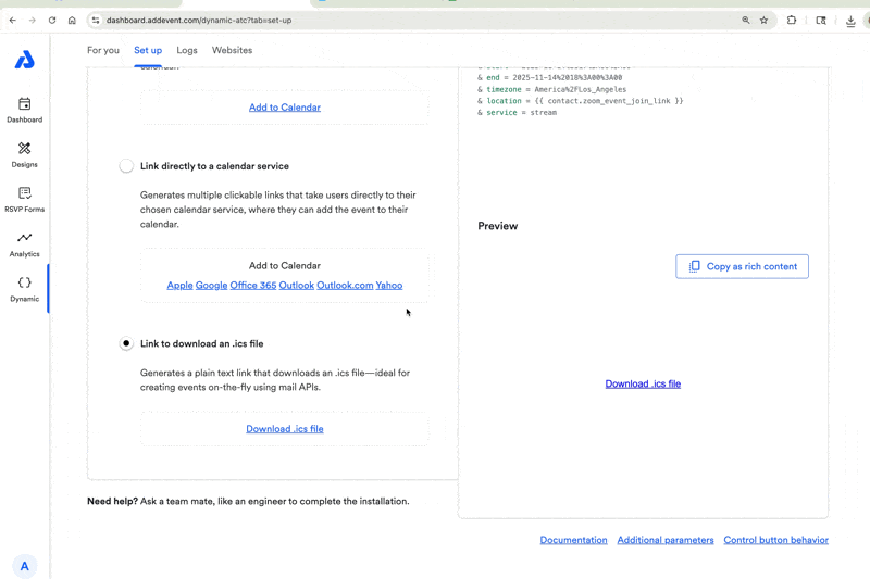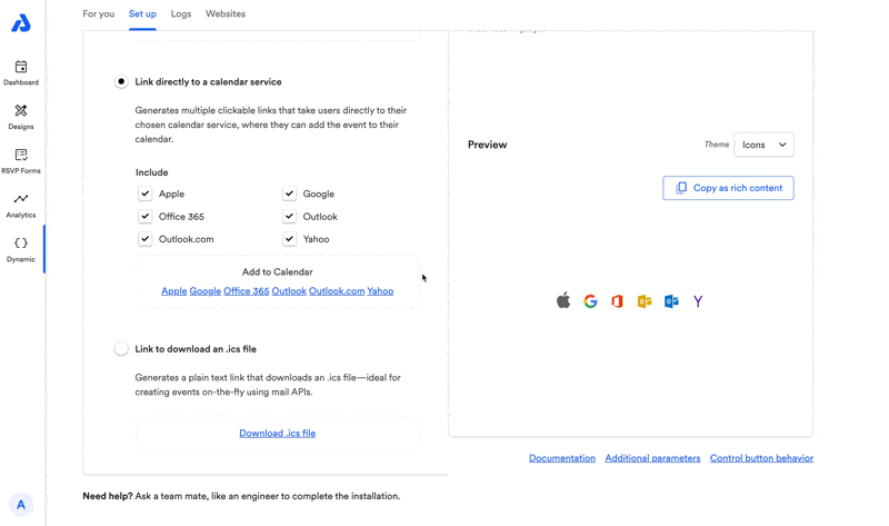 - Navigate to the Dynamic Add to Calendar section then click Set up to get started.