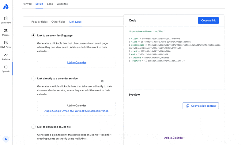 This help doc explains how to create a dynamic event in the Set Up tab in your AddEvent account. Dynamic Add to Calendar Links (dynamic events) are a feature offered by AddEvent to customers that allows you to dynamically create calendar invitations without needing to pre-set specific events in advance. These automated event links can be easily embedded into emails or web pages to streamline scheduling and event invites for users.
